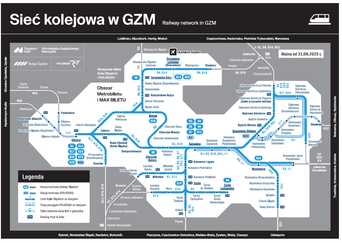 5) Metroticket Network 30 (PLN 249 normal, PLN 124.50 concessionary) – is valid on the entire Transport GZM network and on all lines served by Koleje Śląskie and POLREGIO in the GZM area, including the Tarnowskie Góry – Pyrzowice section via Miasteczko Śląskie Centrum and further on Mierzęcice and Siewierz (in accordance with the diagram);
