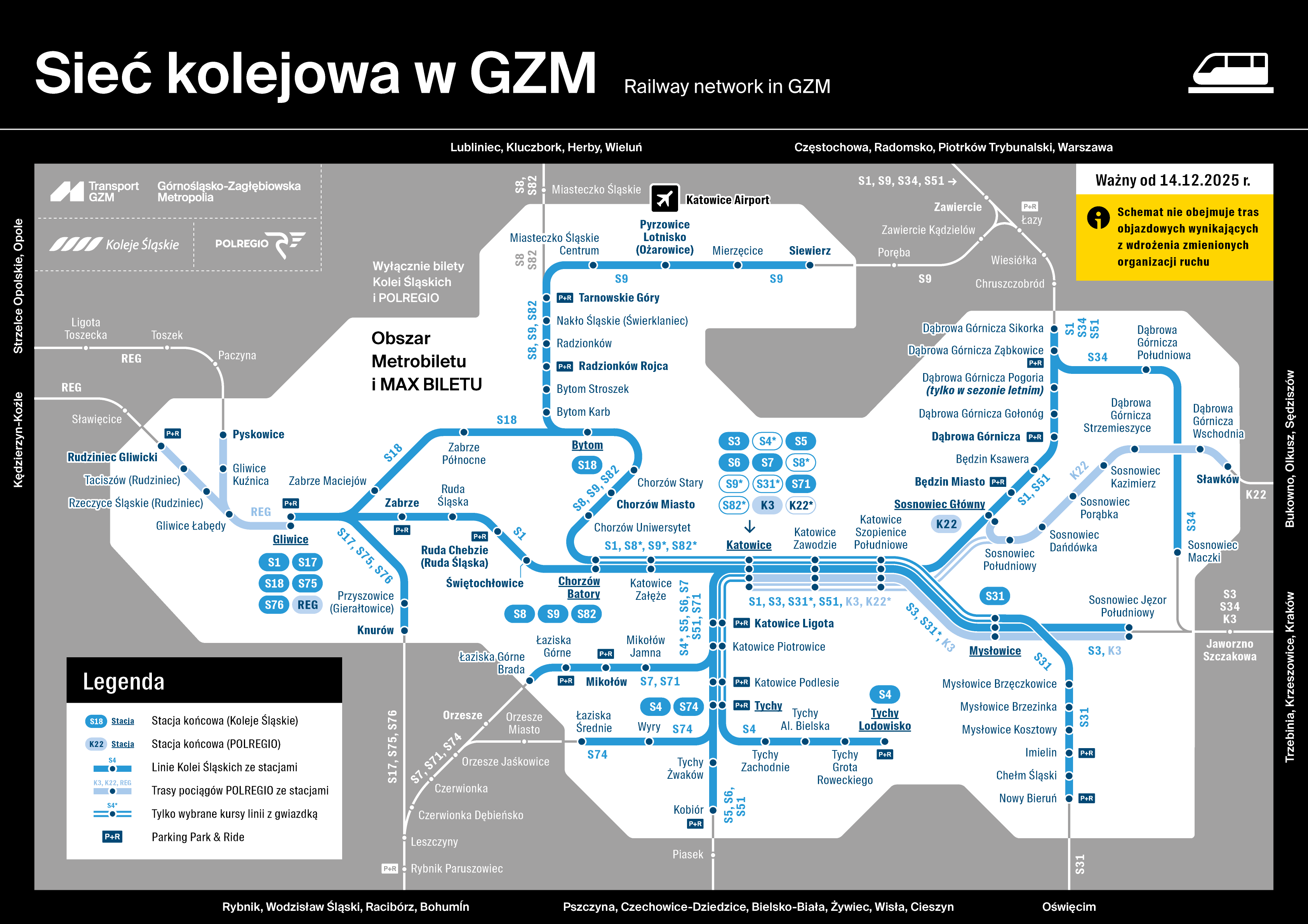3) Metrobilety obowiązują w komunikacji kolejowej wyłącznie na obszarze GZM. Tym samym posiadając Metrobilet na wybraną gminę lub gminy obsługiwane przez Transport GZM, ale leżące poza obszarem GZM, bilet taki nie uprawnia do przejazdów komunikacją kolejową na terenie tych gmin. Wyjątkiem jest odcinek Tarnowskie Góry – Pyrzowice przez Miasteczko Śląskie i dalej Mierzęcice oraz Siewierz (zgodnie ze schematem).